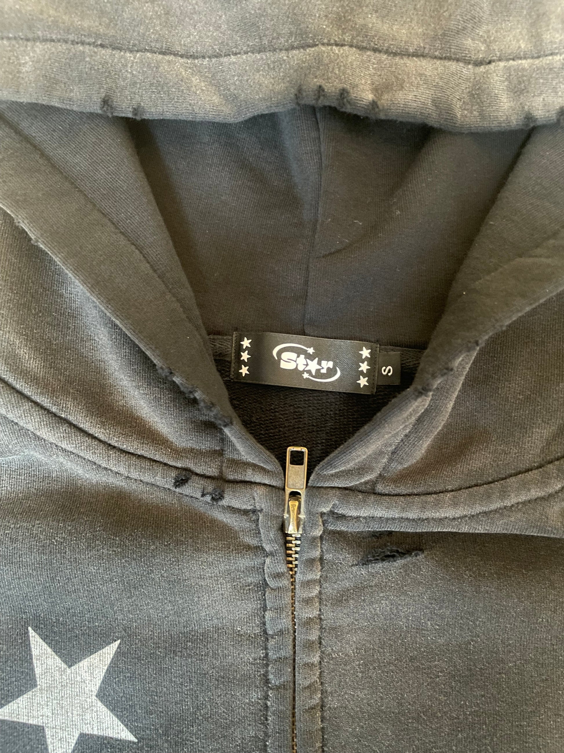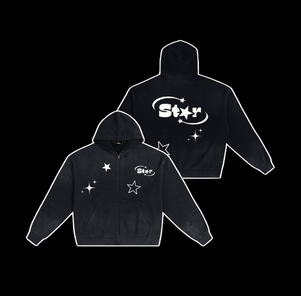 Black Faded Distressed Star Zip-Up Hoodie
